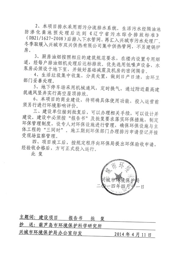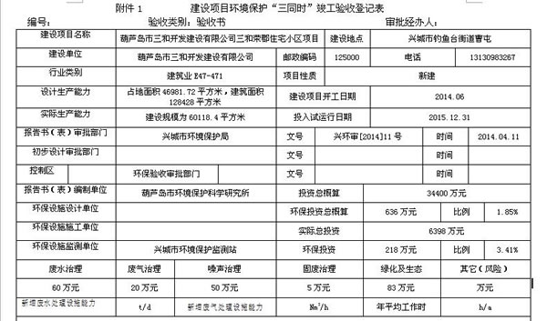 。13)興城市環(huán)境保護局 興環(huán)審【2014】11號文《關于葫蘆島市三和開發(fā)建設有限公司三和榮郡居住小區(qū)項目環(huán)境影響報告表的批復》,2014年4月11日;