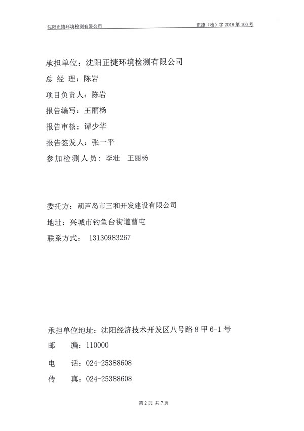。14)沈陽正捷環(huán)境檢測有限公司《葫蘆島市三和開發(fā)建設有限公司三和榮郡居住小區(qū)項目環(huán)保設施竣工驗收檢測報告》,2018年4月2日。