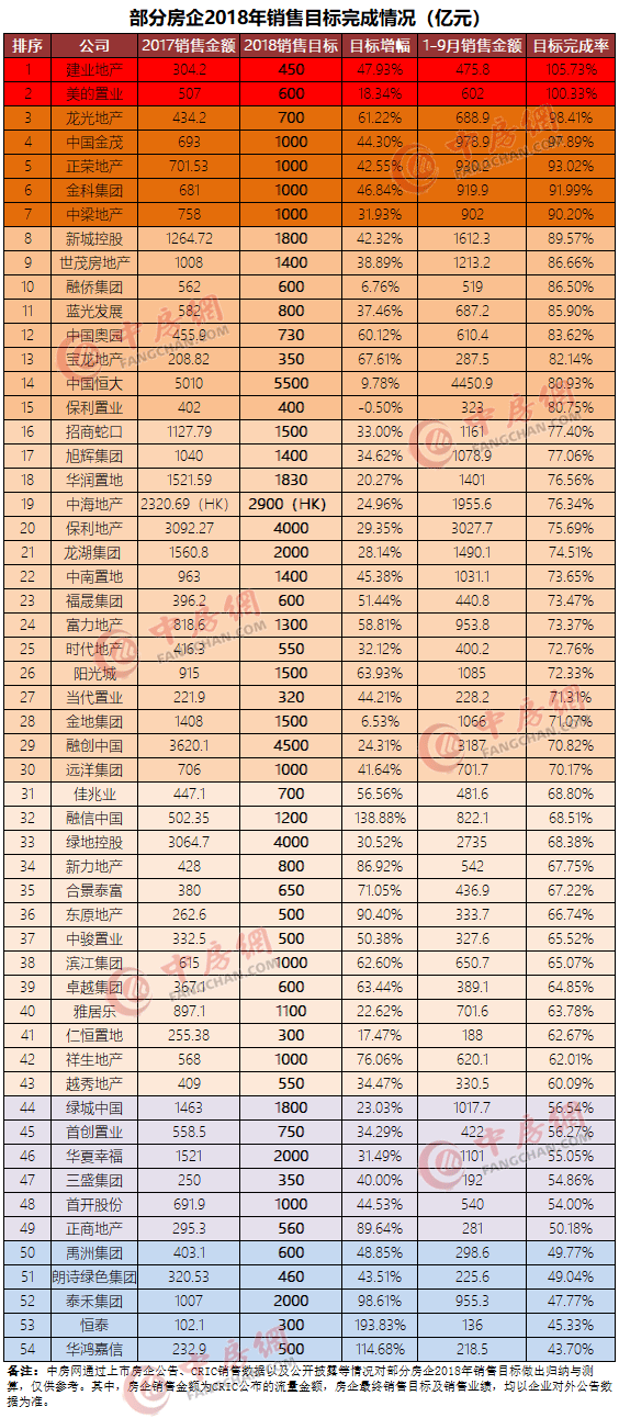 此外,從今年已公布銷售目標(biāo)的54家房企完成情況來(lái)看,前9月銷售目標(biāo)完成率均值為71.74%,比上月提高8.73個(gè)百分點(diǎn),共有49家房企目標(biāo)完成率超過(guò)50%。值得注意的是,建業(yè)地產(chǎn)和美的置業(yè)兩家房企已經(jīng)超額完成全年銷售任務(wù),目標(biāo)完成率分別為105.73%和100.33%。