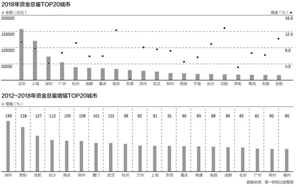 第一財(cái)經(jīng)記者梳理了40個(gè)主要城市2018年底的資金總量,目前京滬的資金總量仍遙遙領(lǐng)先;增速方面,2012~2018年,深圳、貴陽(yáng)、合肥、長(zhǎng)沙、南京的資金總量增幅位居前五,制造業(yè)大市、東北、華北的不少城市增幅都較低。