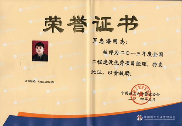 根據(jù)《全國工程建設(shè)優(yōu)秀項(xiàng)目經(jīng)理評(píng)選辦法》,經(jīng)我企業(yè)申報(bào),省市建筑業(yè)協(xié)會(huì)推薦,全國工程建設(shè)優(yōu)秀項(xiàng)目經(jīng)理評(píng)審委員會(huì)審定,我公司羅忠海同志被評(píng)為2013年度全國工程建設(shè)優(yōu)秀項(xiàng)目經(jīng)理。希望該同志再接再厲,繼續(xù)探索工程建設(shè)項(xiàng)目管理的新趨勢(shì)和提高工程建設(shè)工程建設(shè)項(xiàng)目質(zhì)量的新方法,為企業(yè)發(fā)展做出更大的貢獻(xiàn)。