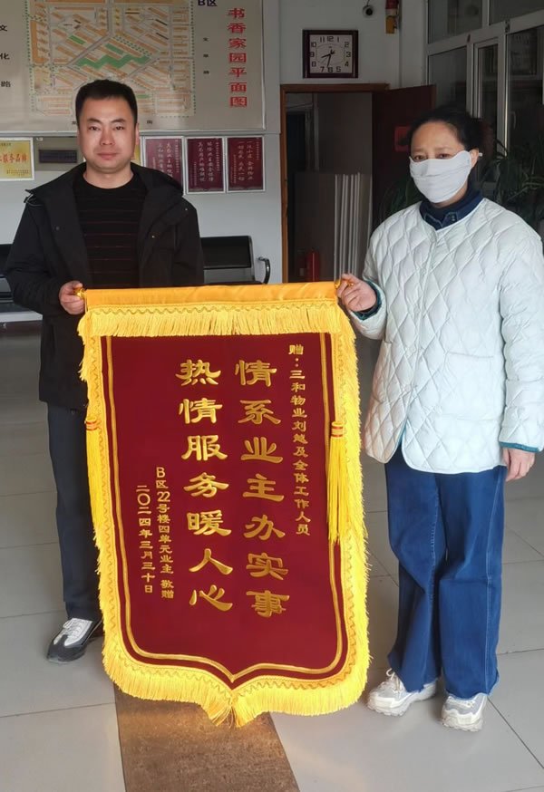 近日,書(shū)香家園B區(qū)一業(yè)主親手將一面繡有“情系業(yè)主辦實(shí)事 熱情服務(wù)暖人心”的錦旗贈(zèng)送給三和物業(yè)團(tuán)隊(duì),以表達(dá)對(duì)他們?cè)谔幚硐滤蓝氯麊?wèn)題上所展現(xiàn)出的高效服務(wù)和專(zhuān)業(yè)務(wù)實(shí)態(tài)度的高度贊揚(yáng)與深深感謝。