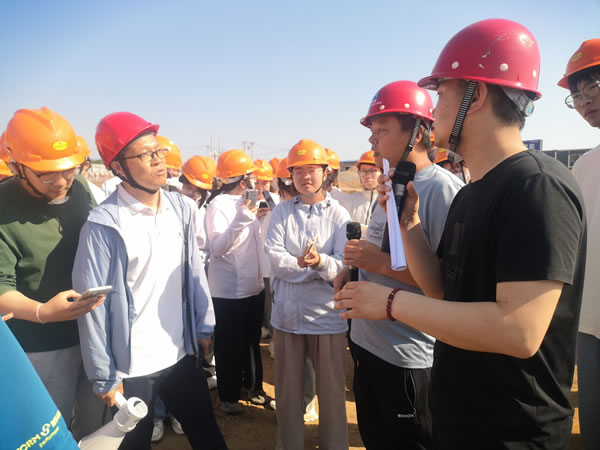 施工現(xiàn)場,于海部長向同學(xué)們詳細(xì)介紹了項(xiàng)目工程概況、工程進(jìn)度、設(shè)計(jì)理念等內(nèi)容,段文博向同學(xué)們介紹了施工工藝和當(dāng)前土方回填、基礎(chǔ)施工等情況。參觀過程中對同學(xué)們提出的問題進(jìn)行現(xiàn)場解答,確保理論與實(shí)踐融合,讓參觀學(xué)習(xí)走實(shí)又走心。