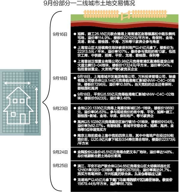 同樣的情況也發(fā)生在其他城市。9月23日,南京土地拍賣會(huì)上集中競(jìng)拍四宗土地,其中中海地產(chǎn)在經(jīng)過(guò)89輪競(jìng)價(jià)后,以20.8億元拿下城北G34商住混合地塊,樓面價(jià)22373元/平方米,創(chuàng)造了南京的樓面價(jià)新高。9 月24日,金隅股份以總價(jià)45.51億元競(jìng)得合肥叉車廠地塊,溢價(jià)率達(dá)148%,總價(jià)格創(chuàng)下合肥土地總價(jià)新高。在廈門,9月25日一向行事穩(wěn)健的龍湖地產(chǎn)以45億元拿下廈門馬鑾灣西部片區(qū)5商住地塊,樓面價(jià)15679.44元/平方米,溢價(jià)率66.79%,無(wú)論是總價(jià)還是樓面價(jià)格都創(chuàng)造了廈門當(dāng)?shù)氐男赂摺?/FONT>