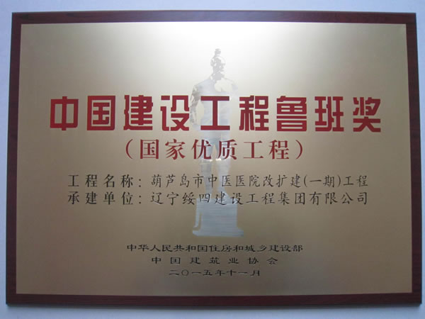 2015年11月17日在北京釣魚臺(tái)國(guó)賓館召開了“2014~2015年度中國(guó)建設(shè)工程魯班獎(jiǎng)”表彰大會(huì),集團(tuán)鐘雷副總經(jīng)理代表公司參加了此表彰大會(huì),由遼寧綏四建工集團(tuán)承建的葫蘆島市中醫(yī)醫(yī)院改擴(kuò)建(一期)工程榮獲“2014~2015年度中國(guó)建設(shè)工程魯班獎(jiǎng)”獎(jiǎng)項(xiàng)。