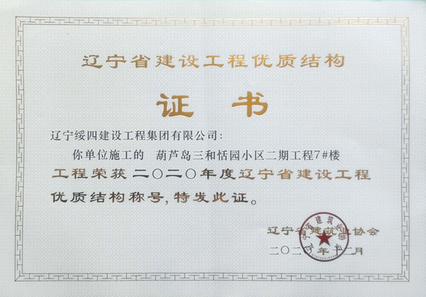 “葫蘆島三和恬園小區(qū)二期工程7#樓”榮獲2020年度遼寧省建設(shè)工程優(yōu)質(zhì)結(jié)構(gòu)稱號