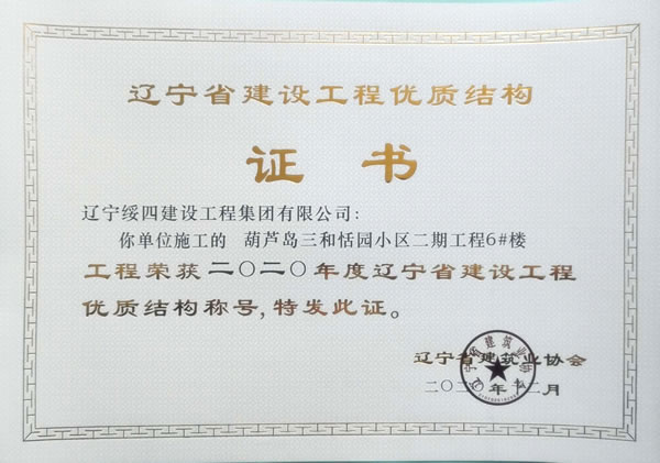 “葫蘆島三和恬園小區(qū)二期工程6#樓”榮獲2020年度遼寧省建設工程優(yōu)質結構稱號