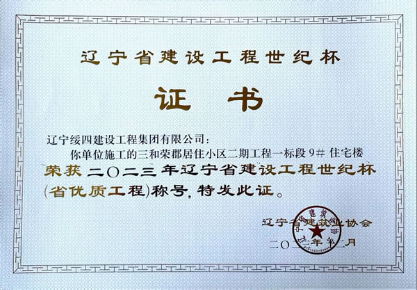 三和榮郡居住小區(qū)二期工程一標段9#住宅樓 榮獲2023年遼寧省建設工程世紀杯(省優(yōu)質工程)稱號