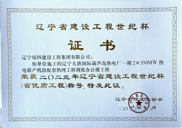 遼寧大唐國際葫蘆島熱電廠一期2×350MW熱電聯產機組配套熱網工程調度辦公樓工程 榮獲2023年遼寧省建設工程世紀杯(省優(yōu)質工程)稱號